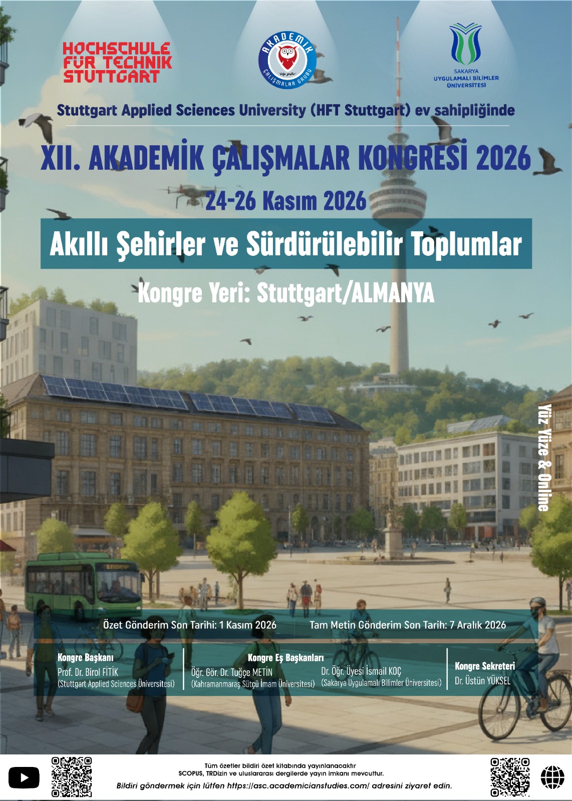 XII. Akademik Çalışmalar Kongresi (ASC-2026/GÜZ) 24-26 Kasım 2026 tarihleri arasında Stuttgart Applied Sciences University ev sahipliğinde ev sahipliğinde düzenlenecektir.